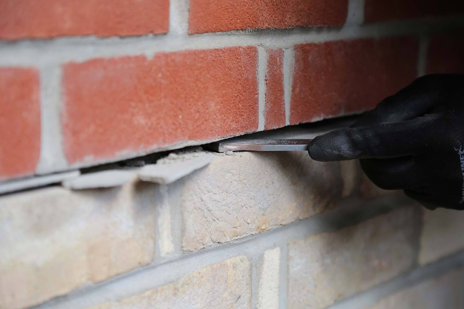Complete the process by restoring the bed joint and filling the vertical crack with an appropriate filler to match the surrounding masonry.