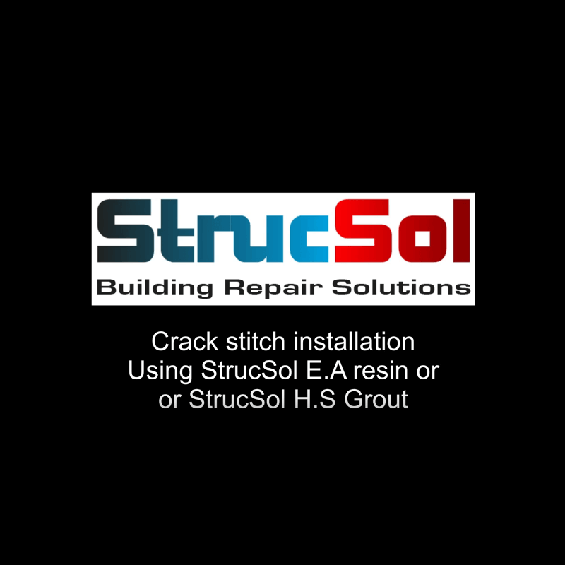 Crack stitching is carried out using either Strucsol Ultrabar 6mm x 1000mm OR Strusol Ultrabar Composite 6mm x 1000mm, and either Strucsol HS Grout or Strucsol Polyester Resin Strucsol HS Grout. This is a non shrink, high strength grout. It sets around the crack stitching bars and develops compressive strength rapidly to prevent axial deflection of the crack stitching bar under load conditions.